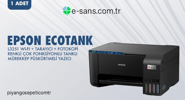 1 adet 6.999,00 TL değerinde Epson EcoTank L3251 Wi-Fi + Tarayıcı + Fotokopi Renkli Çok Fonksiyonlu Tanklı Mürekkep Püskürtmeli Yazıcı